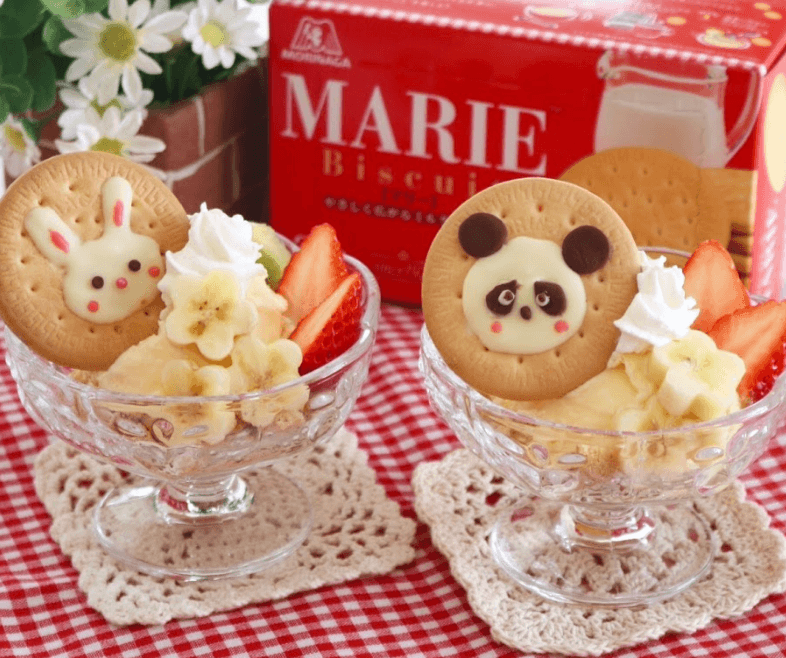 砕いた「マリー」ビスケットを敷いたグラスにバニラアイスを入れ、さらにいちごやバナナなどのフルーツとホイップクリーム、チョコペンなどでデコった「マリー」をのせました。