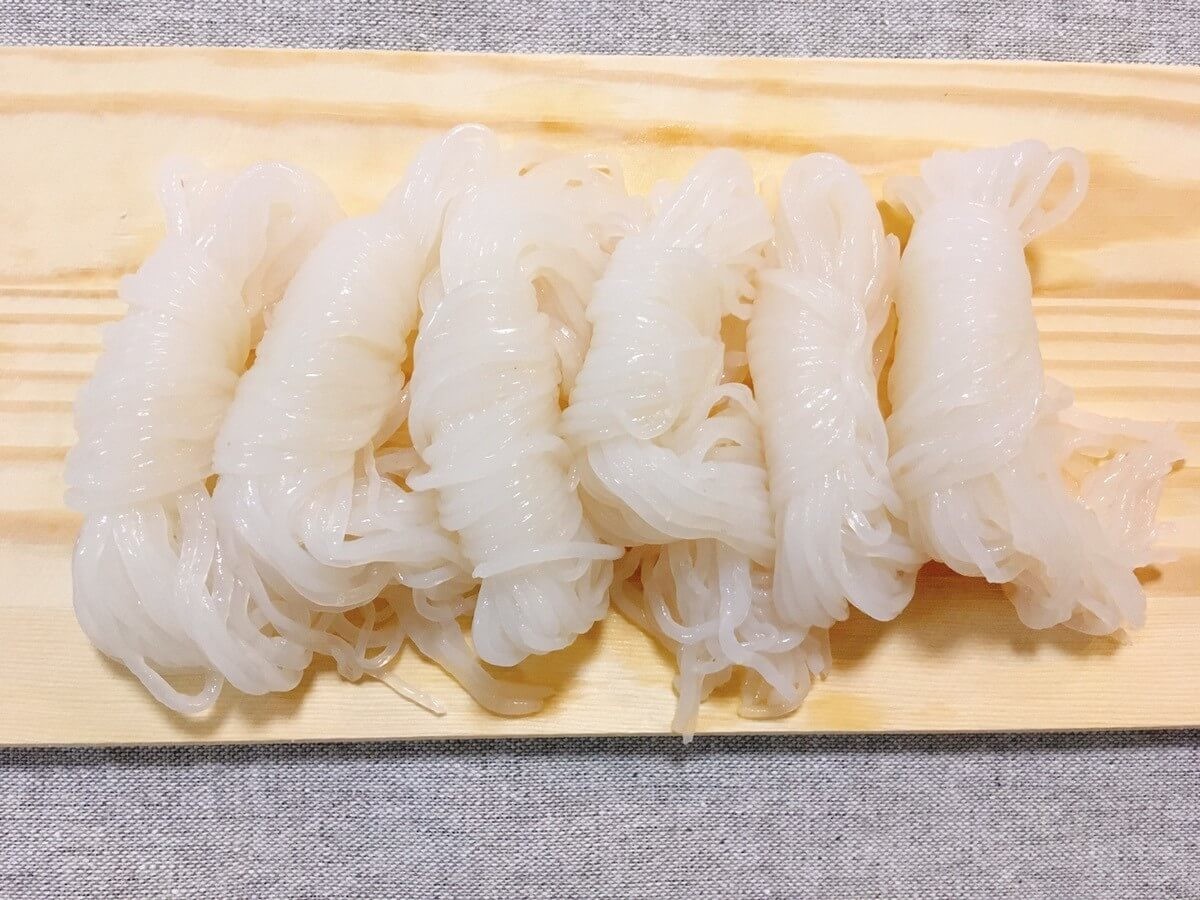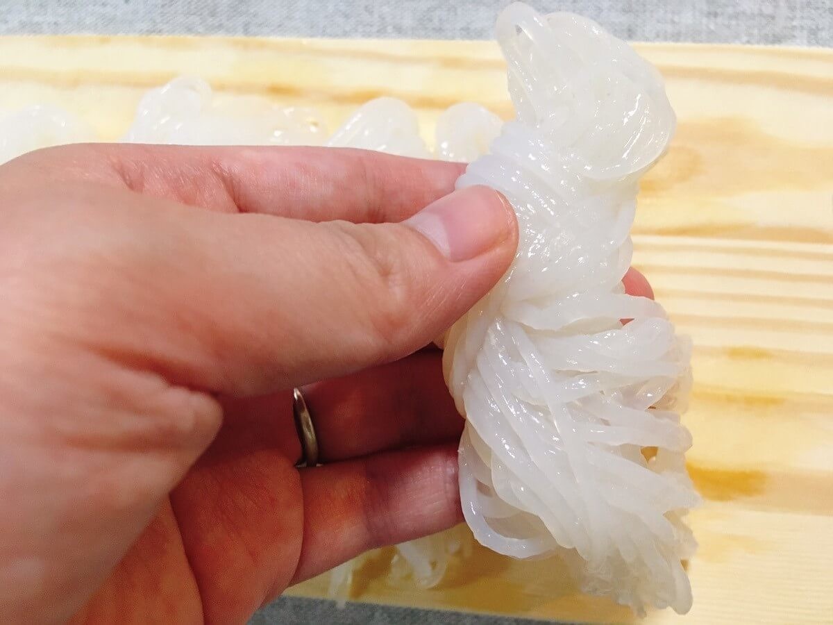 白滝や糸こんにゃくに似ていますが、また違った食感が楽しめるのも、手結びこんにゃくの良いところ。