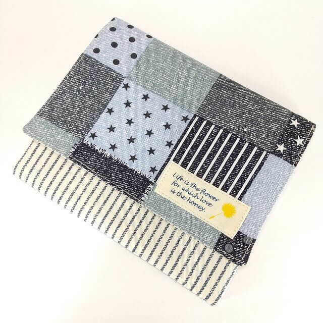 パッチワーク風デニム生地とスタライプ柄の生地を使っている移動ポケットです。
