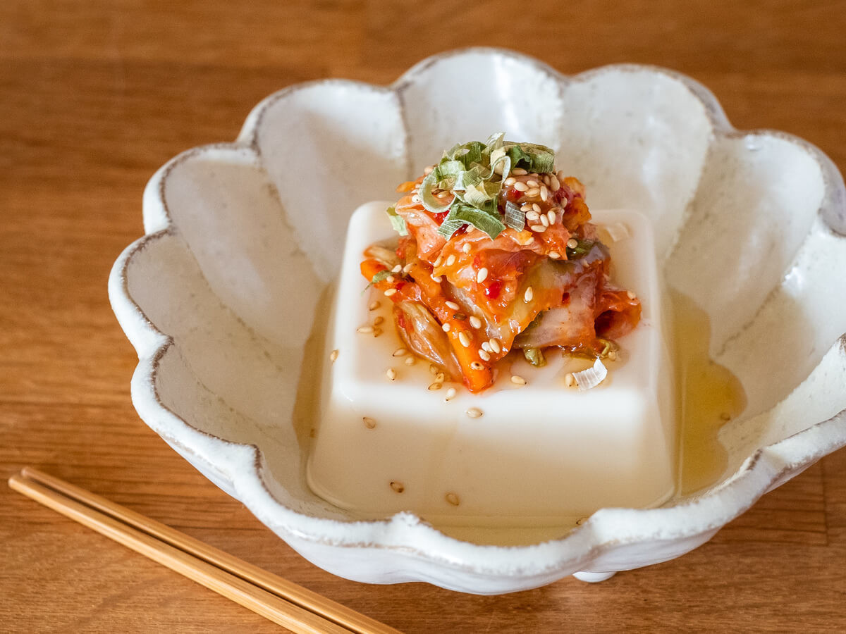 業務スーパーの「白菜キムチ」を豆腐にのせてごま油&しょうゆをかけて「キムチやっこ」にしていただいてみました。