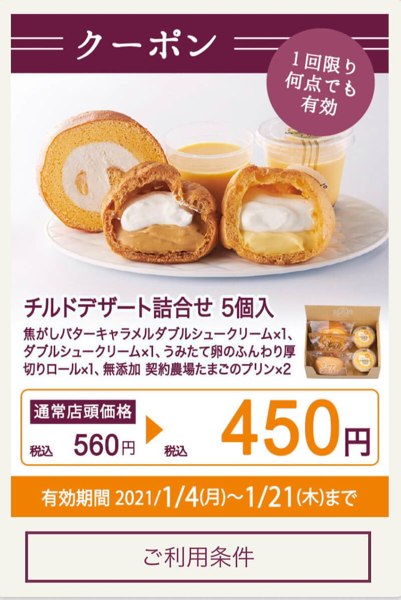 クーポン使用で110円、人気スイーツ1個分が無料になるお得なもの!