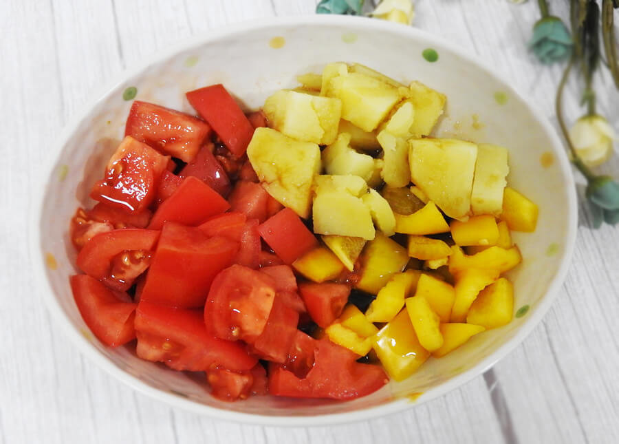 まずは、温野菜(赤パプリカ・黄パプリカ・トマト・じゃがいも)の味付けに使ってみました。