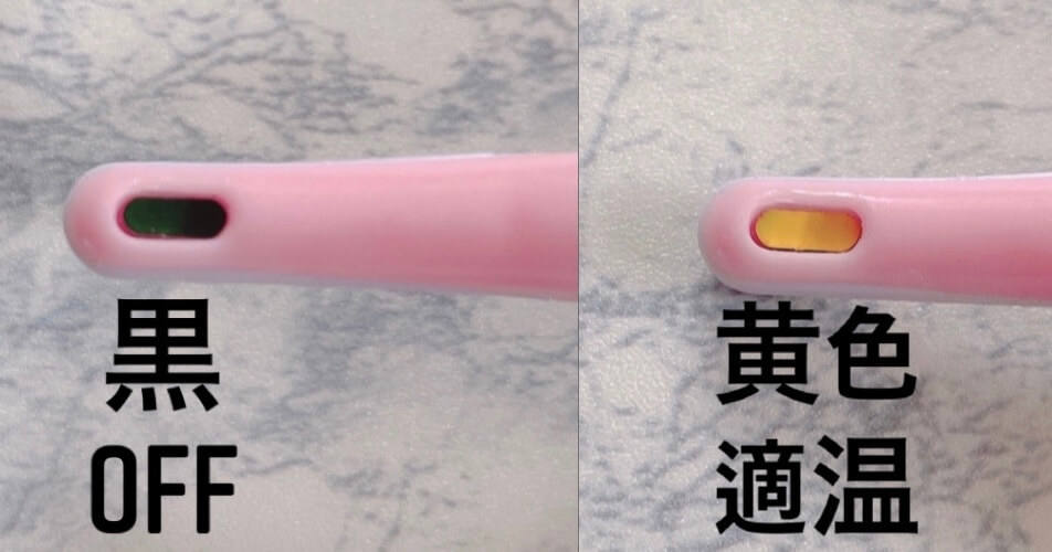 本体裏側の先に適温マークがありOFFの時は黒色を、電源を入れ適温になると徐々にマークの色が黄色に変化していきます。