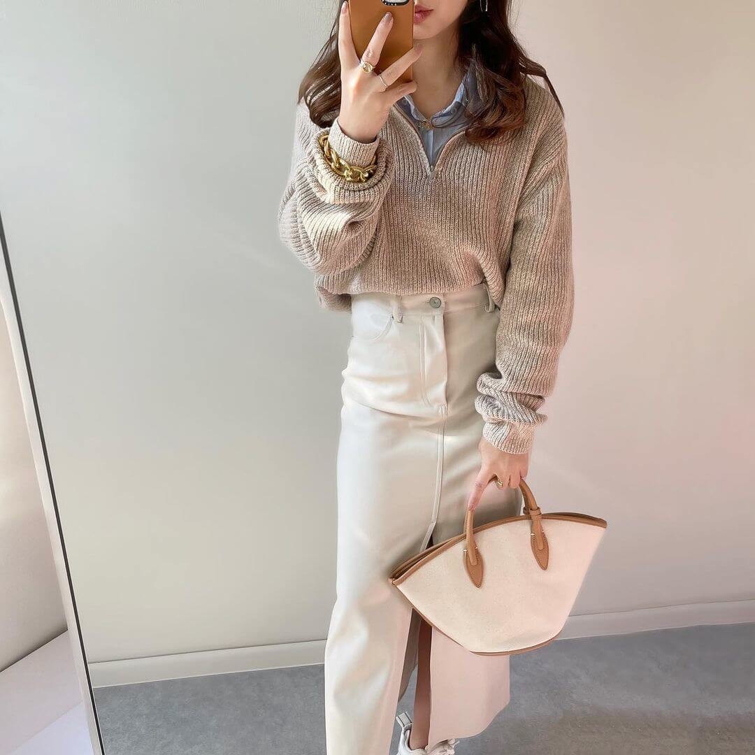 ボリューミーなセーターをウエストインで着こなして、スッキリとしたシルエットを表現しています。