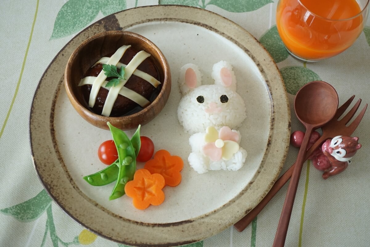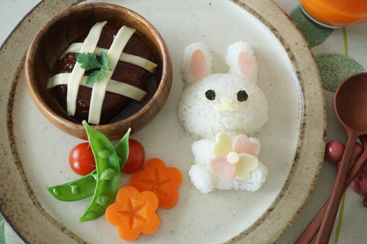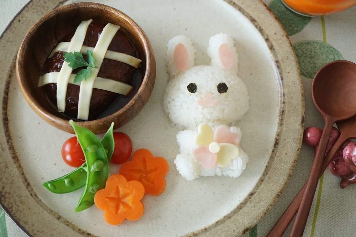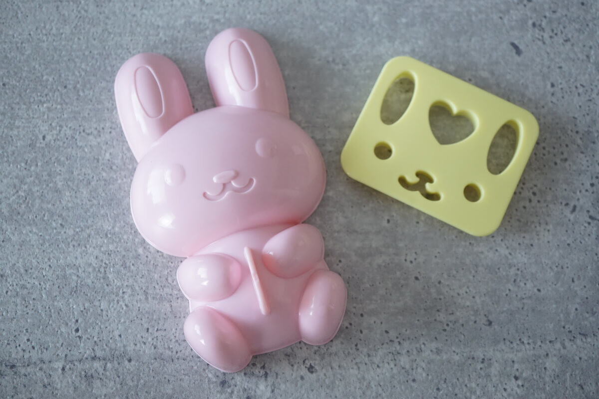 「ごはんをつめる型」の他に「抜き型」もついているので、ウサギの立体ごはんに簡単に顔をつけることができます。