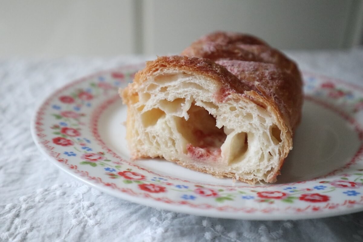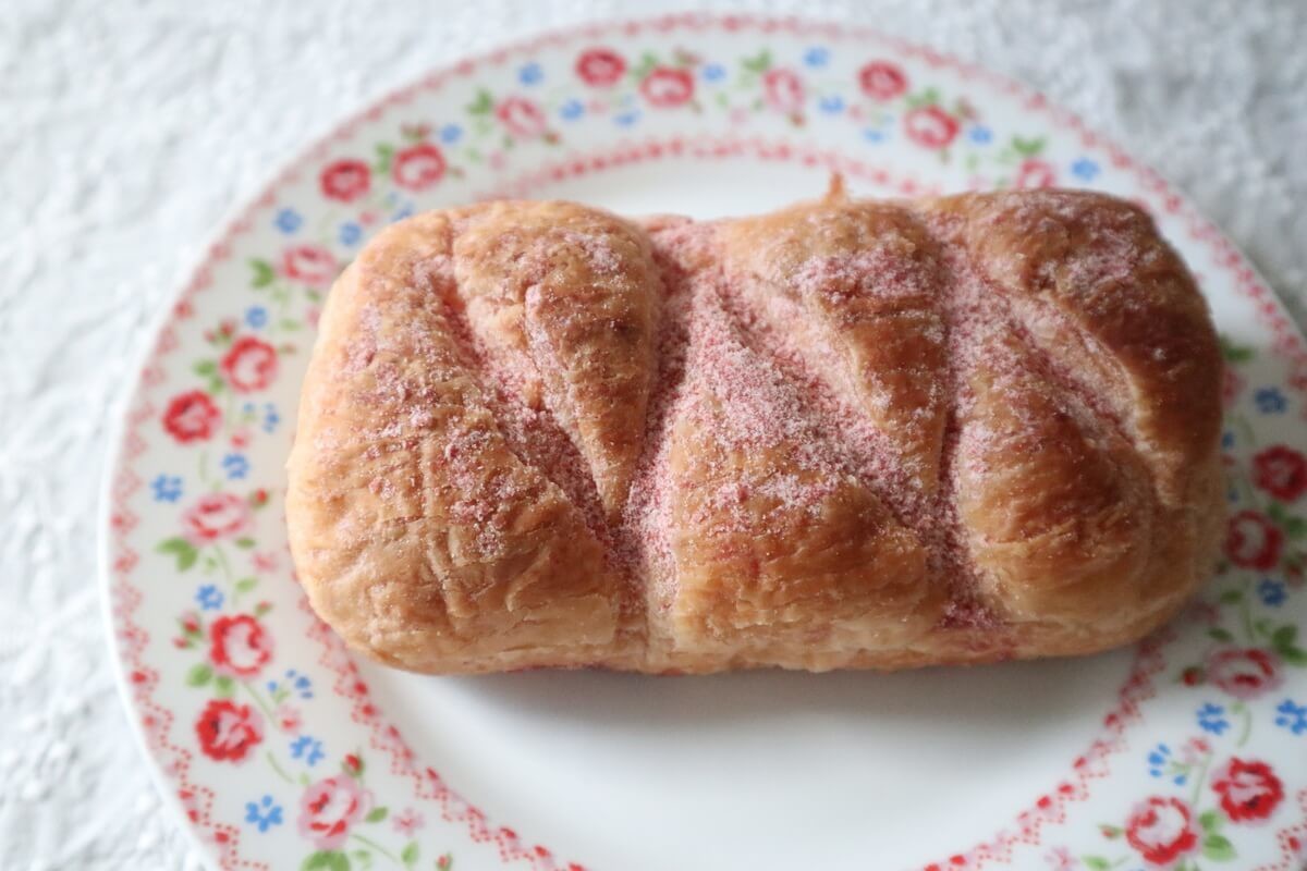 デニッシュ生地に甘酸っぱいいちごパウダーがかかっており、ほんのりピンク色に!