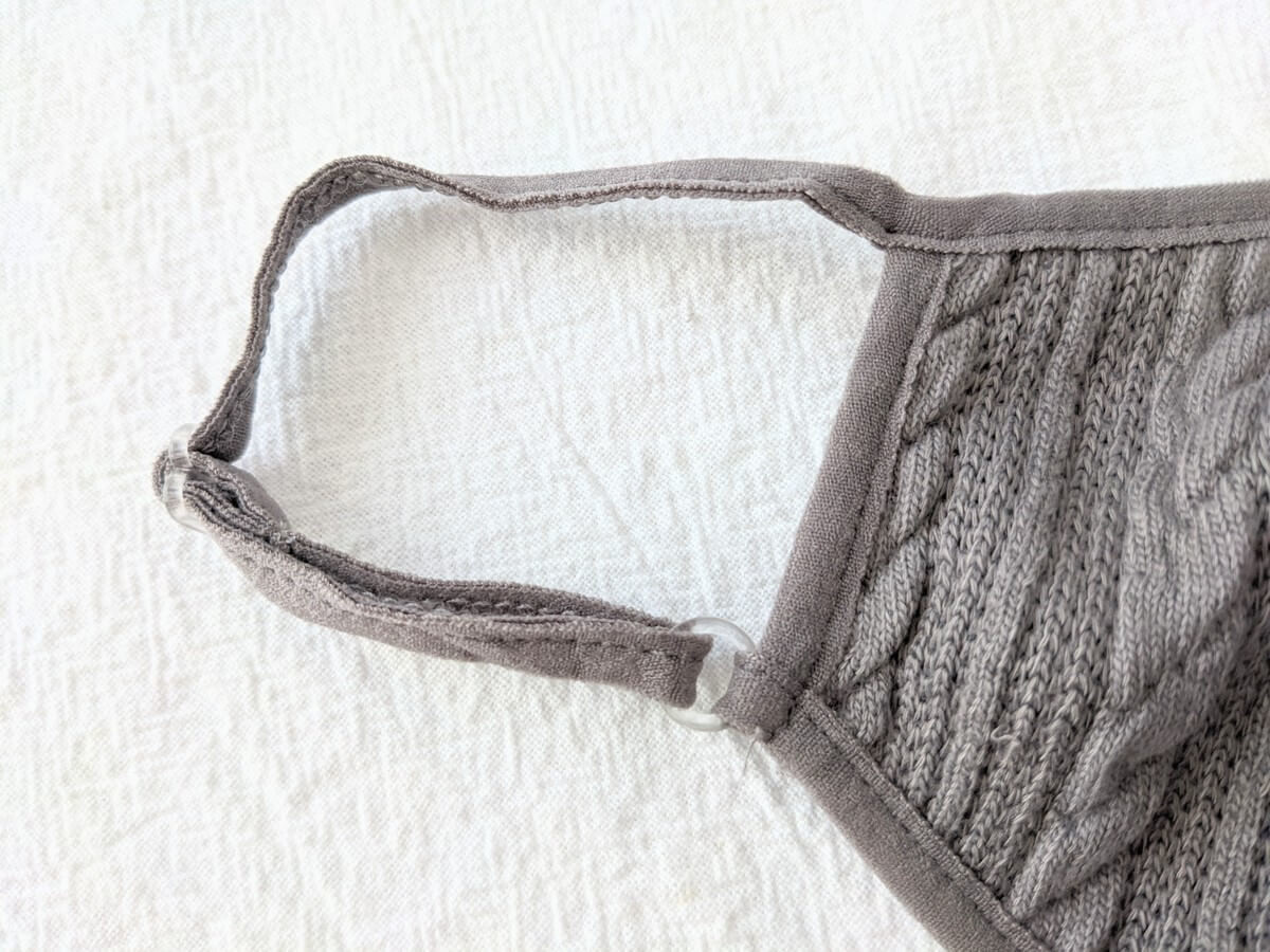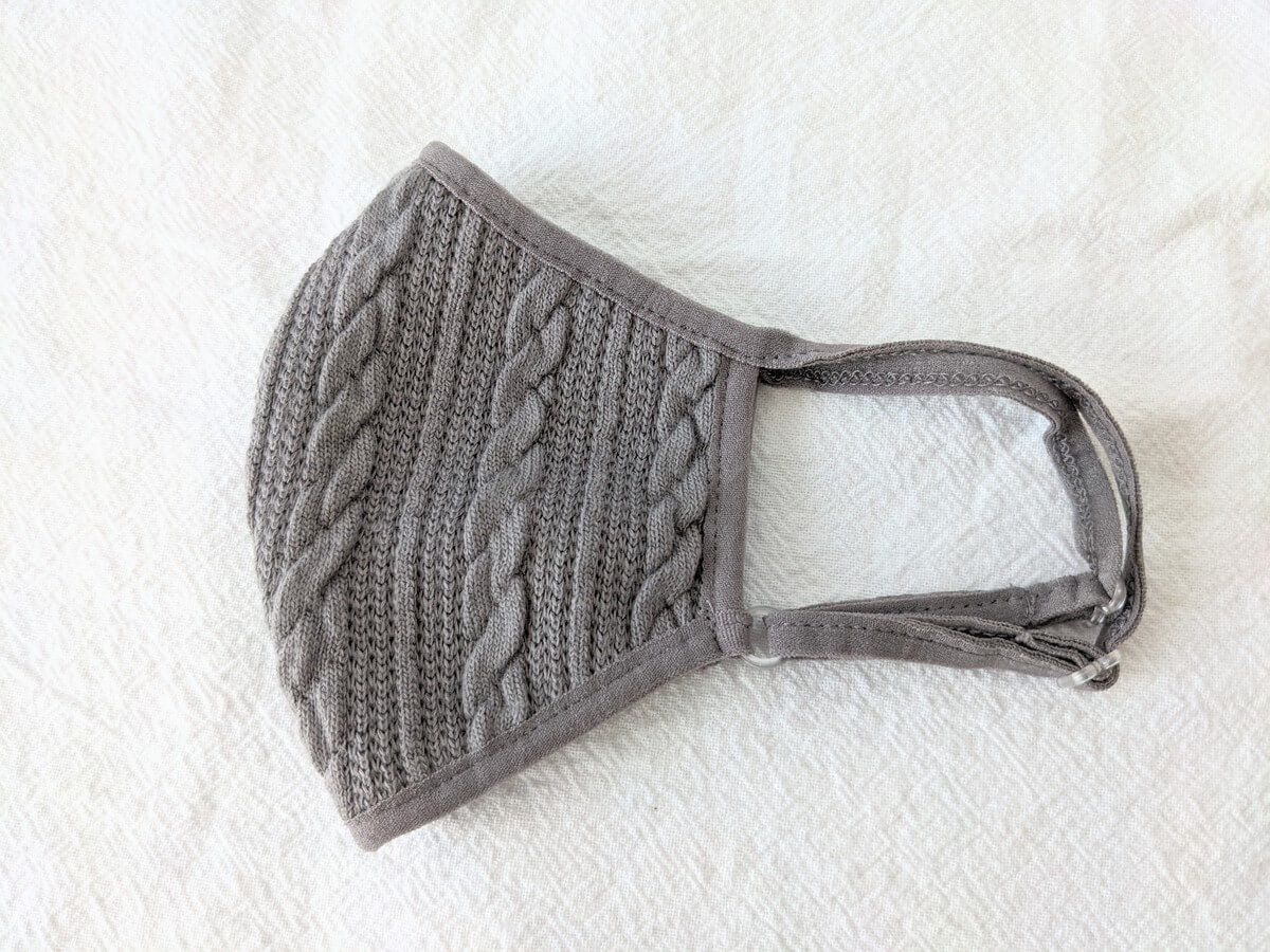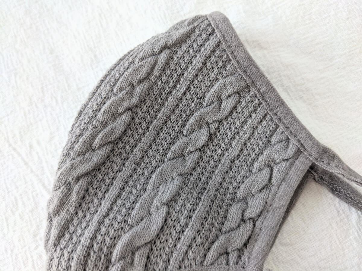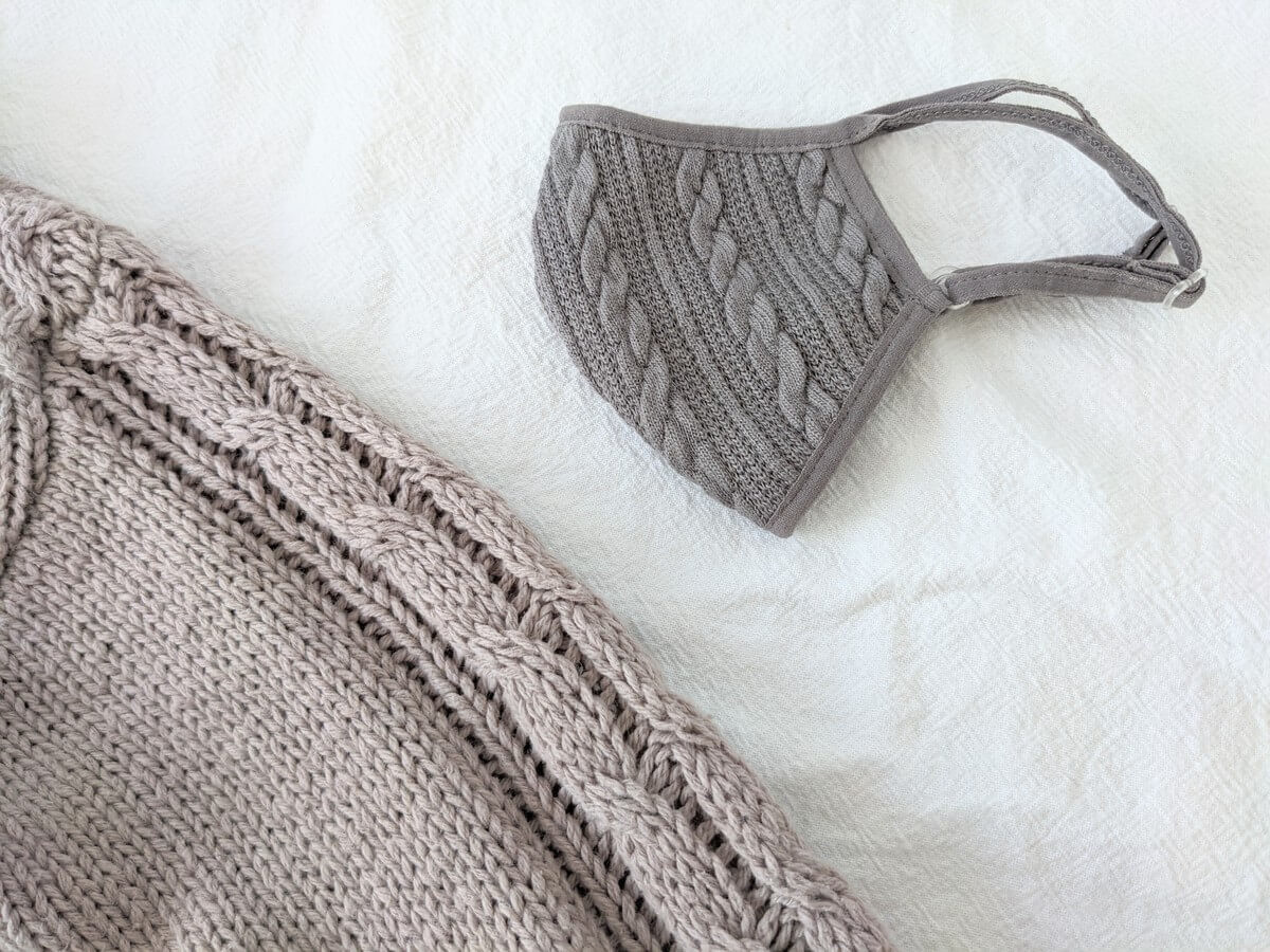 こちらが一目惚れして購入したケーブルニット風マスク。 購入の決め手は、今流行りの「くすみカラー」であることと、マスクを付けるだけで「小顔効果」が期待できること!