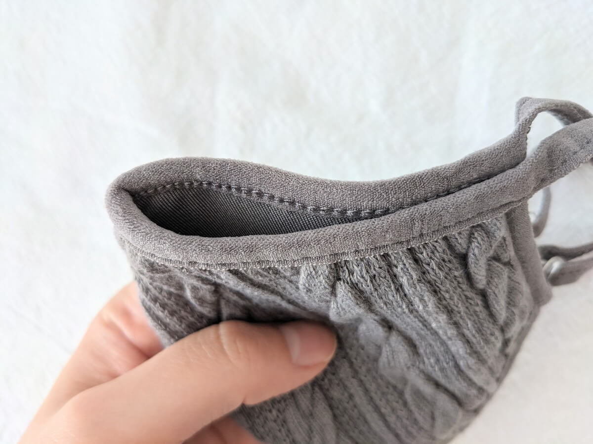 私が選んだ裏地は、つるつるした肌触りが特徴のポリエステル生地。 呼吸をすると裏地が少し口に吸い付く感じはありますが、息苦しさはなく予想以上の付け心地の良さです!