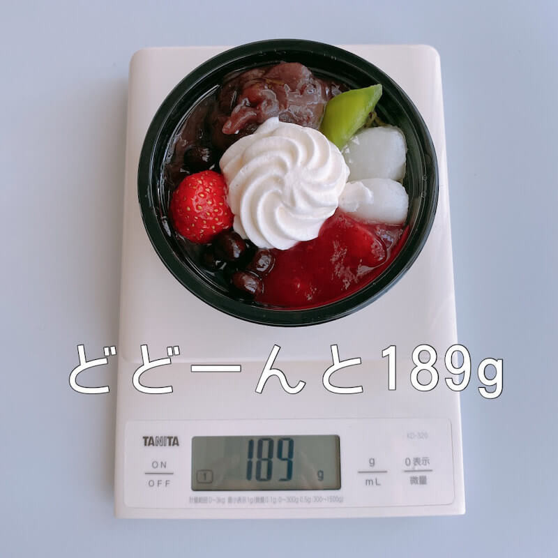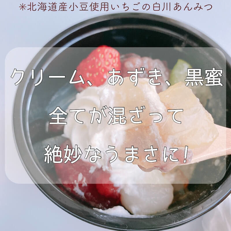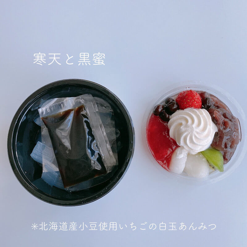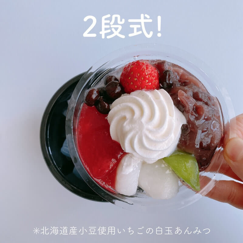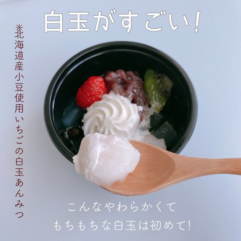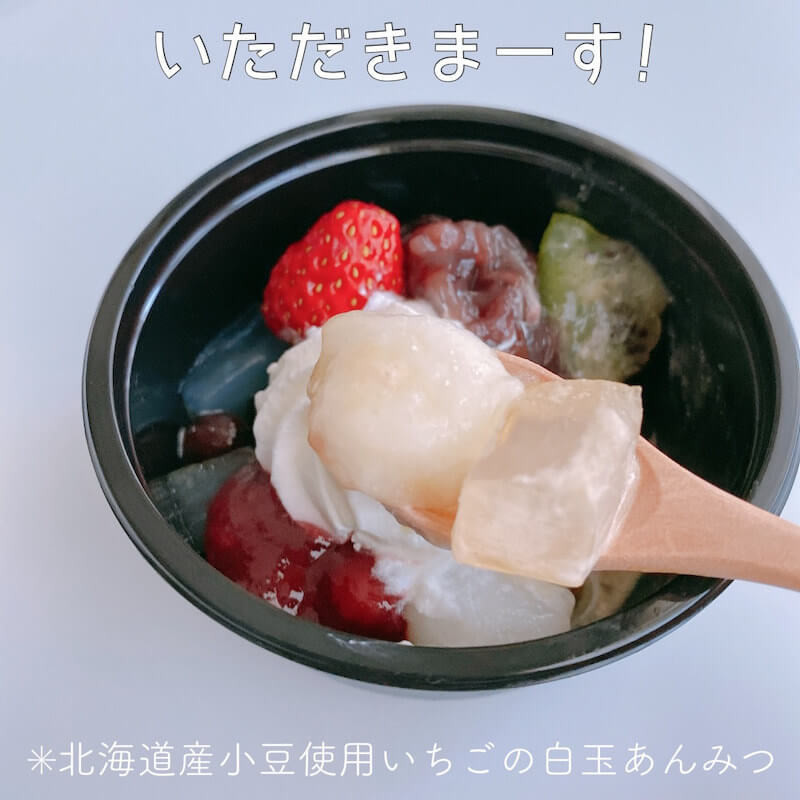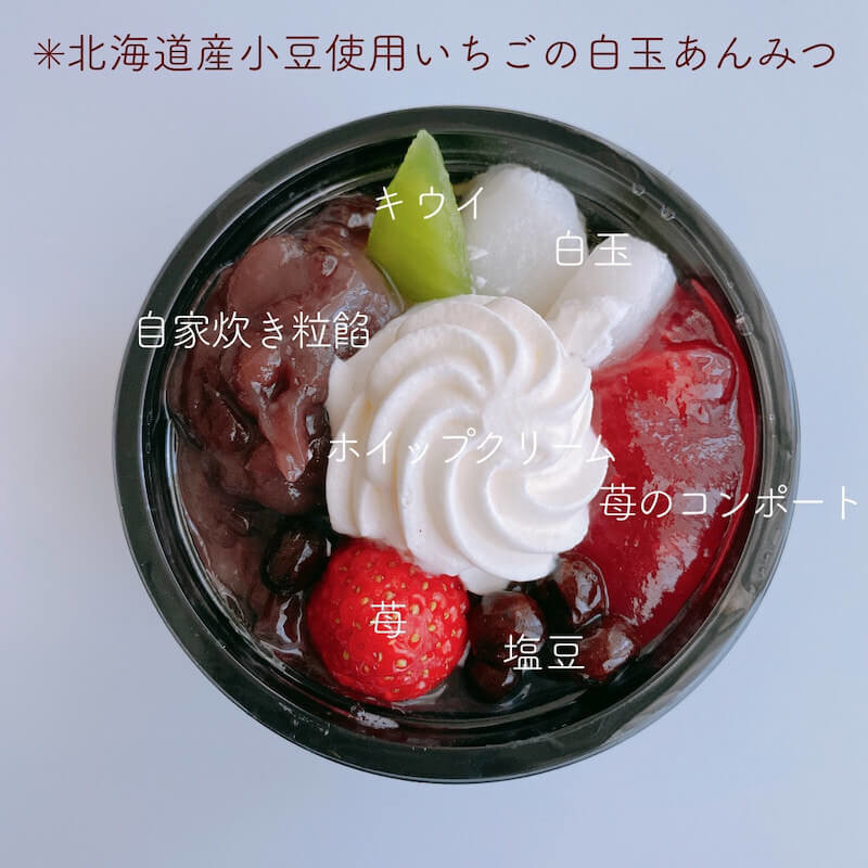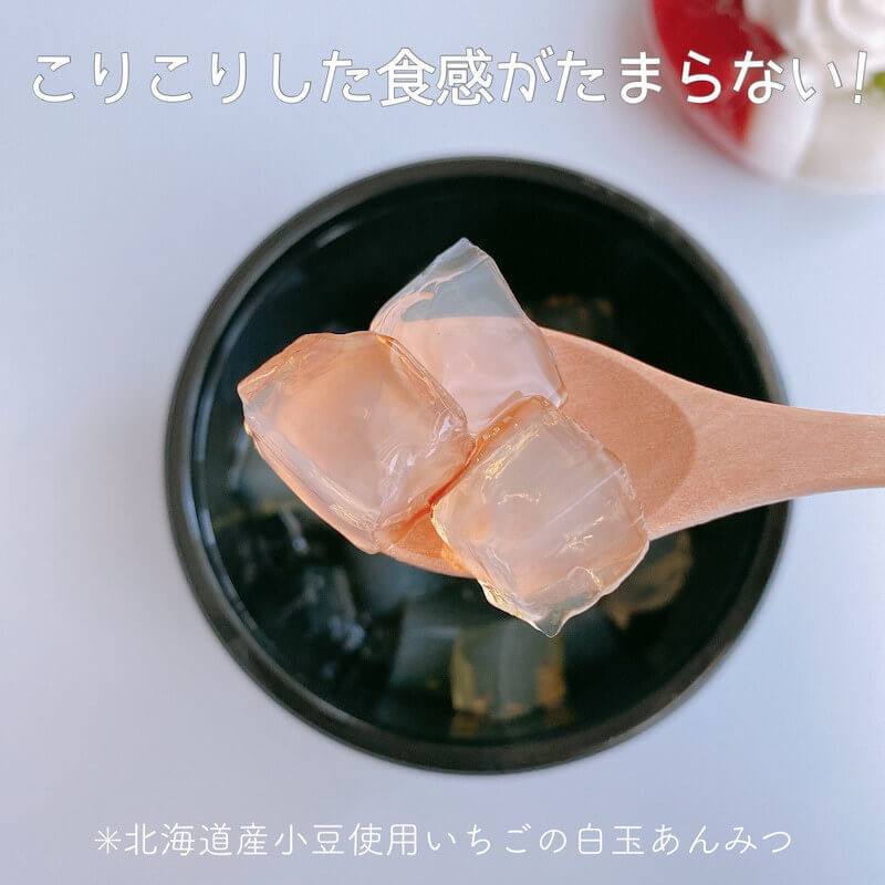 - 北海道産小豆使用いちごの白玉あんみつ 280円(税込み302円)