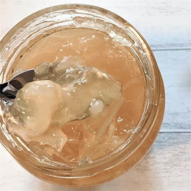 スプーンですくってみると、蜂蜜のようなとろーり感はなくゲル状ですね。レモンの皮までしっかり入っています。