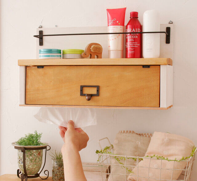 最初にご紹介するのは箱ティッシュがすっぽり入ってしまう壁掛け収納棚です。