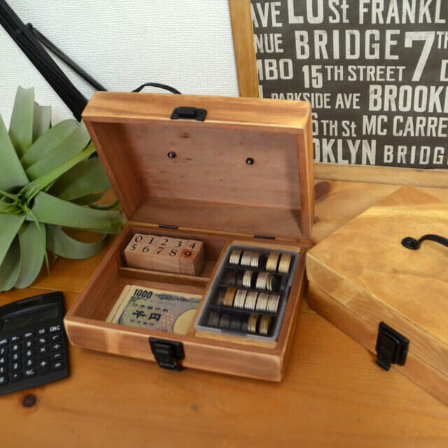 こちらは家計管理やフリーマーケットなどのイベントなどでも使える木製の金庫です。