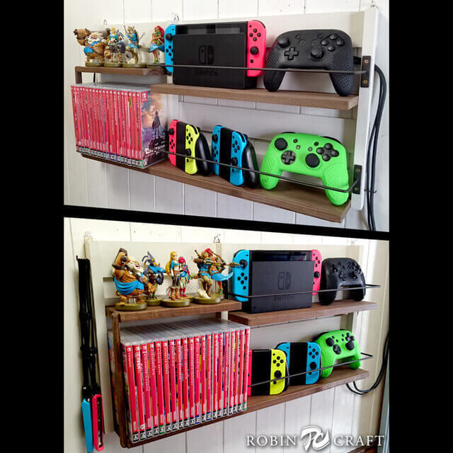 こちらはSwitchを収納できる壁がけの棚です。ゲーム本体はもちろん、ノンケーブルのコントローラーやソフトも最大で20本収納が可能!