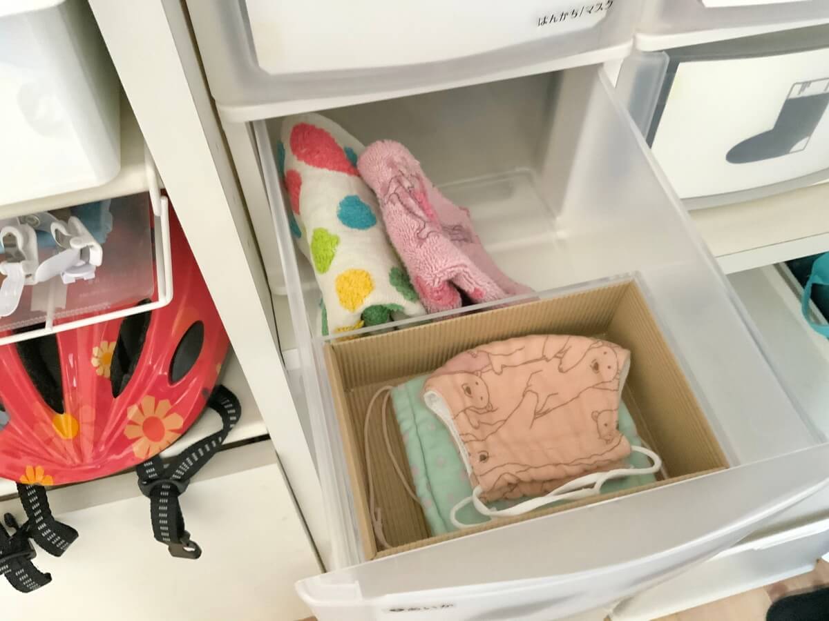 子どもたちはこれら一式を、玄関クローゼット内のニトリの引き出しに収納しています。家を出る直前に、身支度のついでにマスクを着用します。