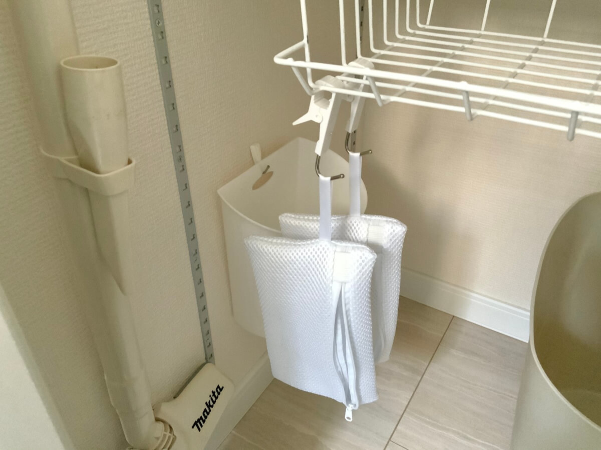子どもたちがすることなので、面倒に感じないように、洗濯カゴのすぐ横に、フックを使って専用のネットを用意しました。
