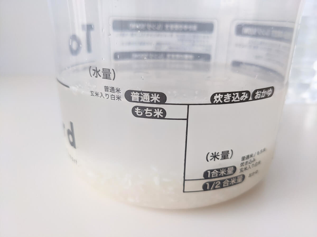 容器には水量と米量の目盛りが付いているので、正しい容量かどうか確認できます。
