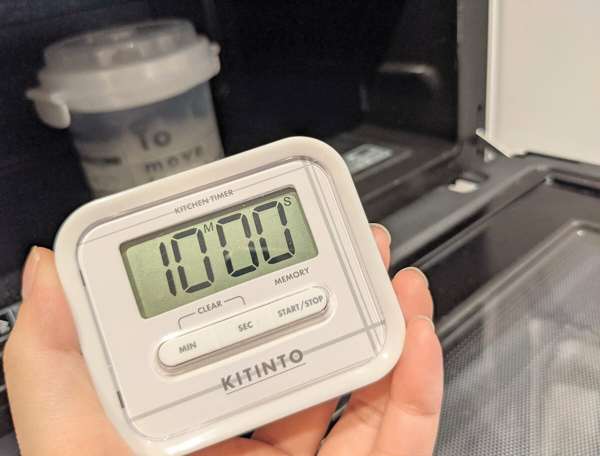 お米を水平にした状態でレンジに入れ、500Wで10分加熱します。