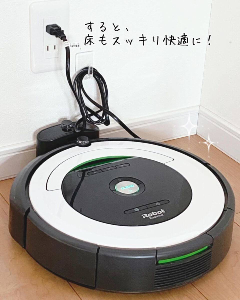 お部屋を自動で掃除してくれる便利家電のルンバ。固定した位置に置く為、配線が床につくのが気になります。そこでルンバの近くにピタッコを付ける事でコードが掛けられてスッキリ。