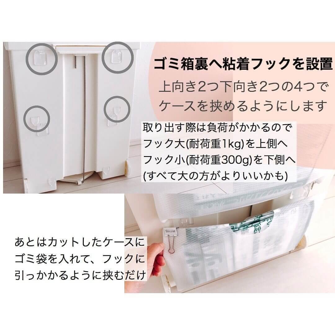 作り方はとても簡単で、ゴミ箱の裏にピタッコを付け、そこにハサミでカットしたEVAケースをハメたら完成です!直ぐに真似できる活用術ですよ。
