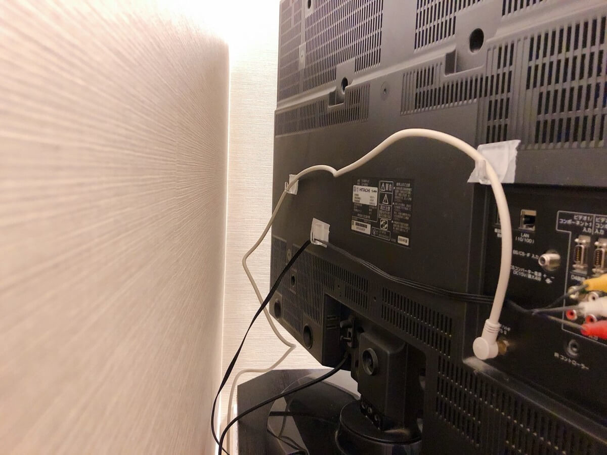 配線問題に悩んでいる方におすすめなのが、テレビ裏にピタッコを数カ所貼って配線の道を作ることです。