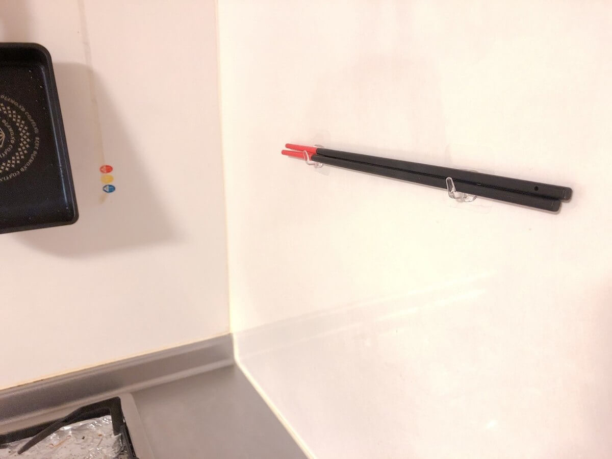 調理中など、ちょっと菜箸を置きたい時に役立つのがキッチンの壁にピッタコを張る方法です。キッチン周りは、おたまやフライ返しなど調理道具を掛ける様に使用することも多いですが、菜箸置きとして使うのもおすすめです。