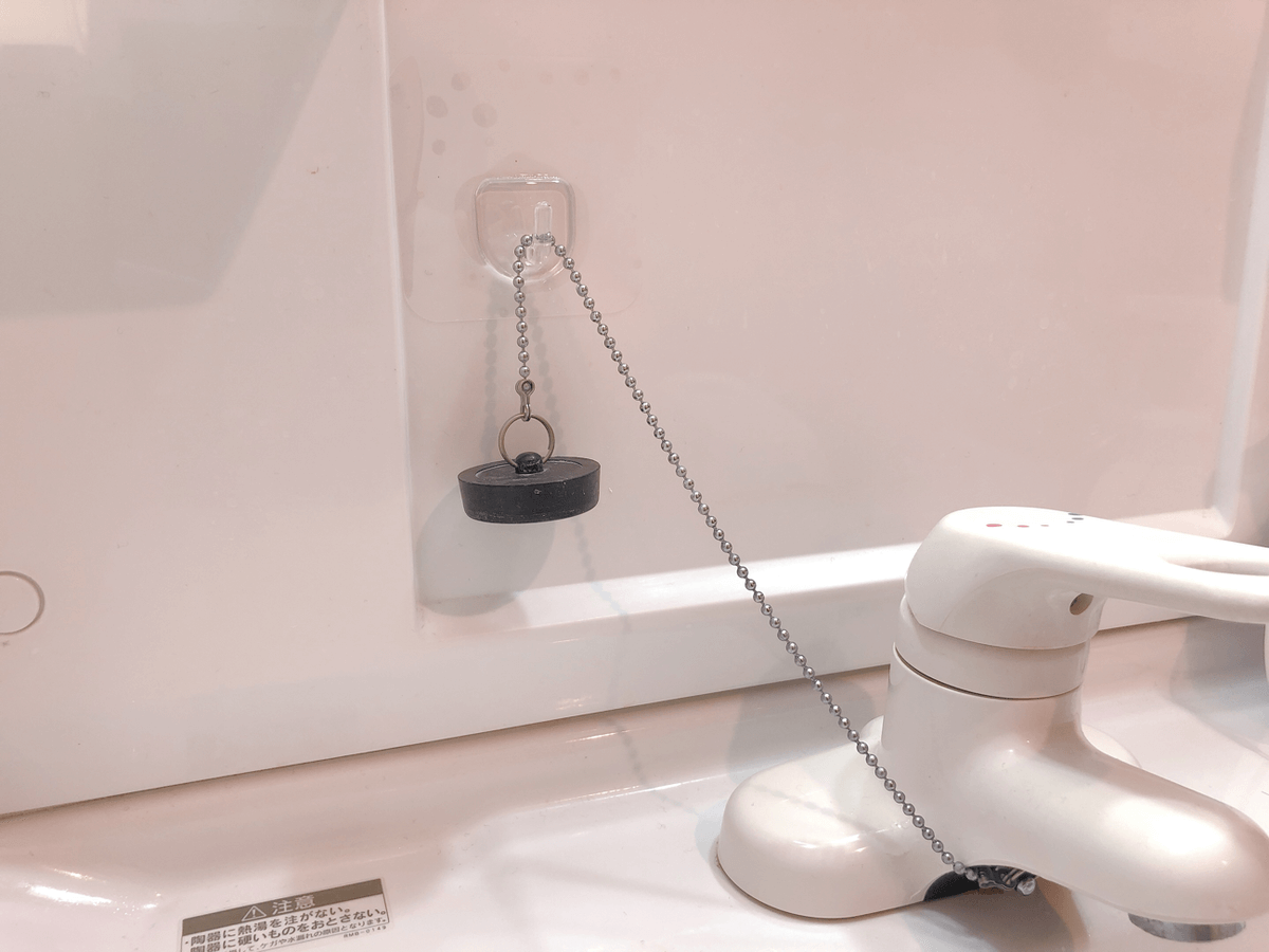 洗面台で水をためる時に使うゴム栓。掃除もやりにくく困っていましたが、ピタッコを使うことで解決。写真のように掛けるだけで下に付かなくなり、清潔感も出て掃除がかなりラクになります!