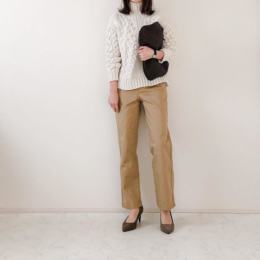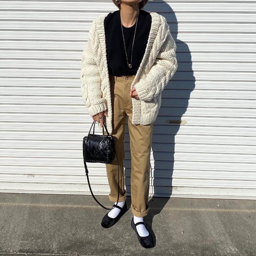 ケーブル編みのニットでカジュアルダウンして、垢抜けたミックスコーデが出来上がり。