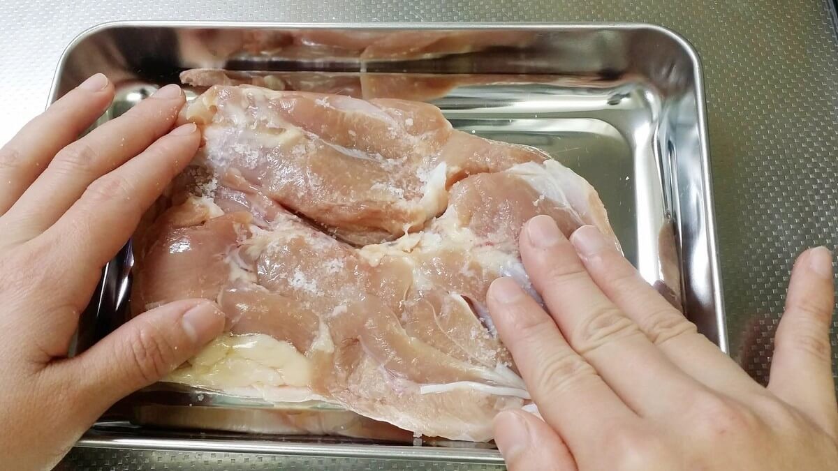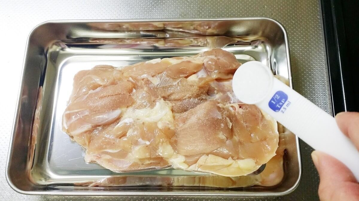 鶏もも肉焼くだけレシピ①肉の1%ぶん塩をもみこむ