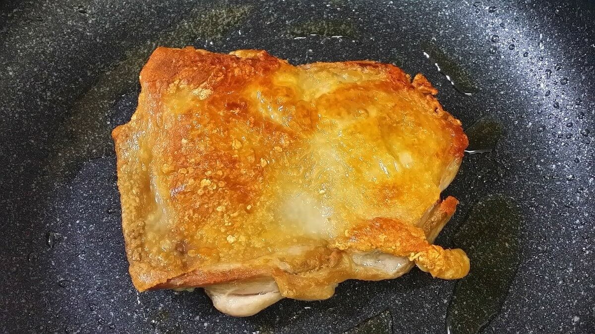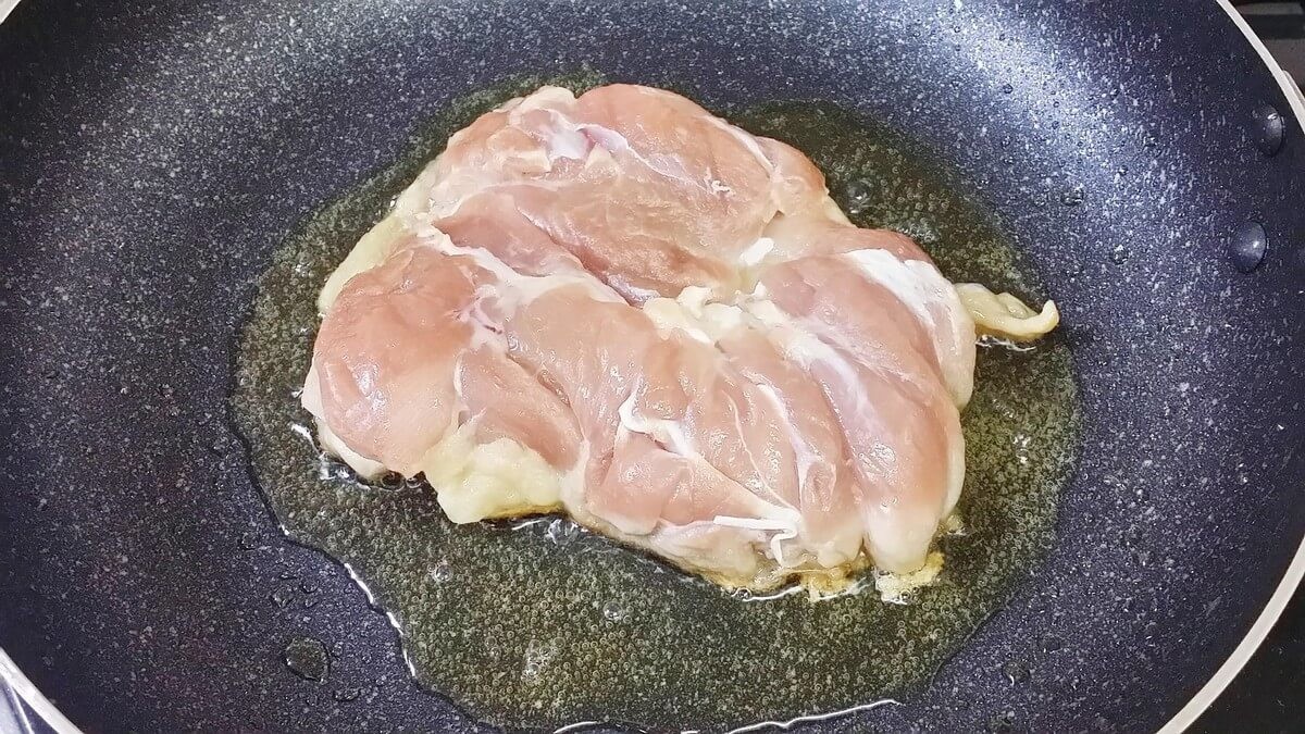 2晩冷蔵した鶏もも肉の見た目に変化はありませんでした。油をしいたフライパンに皮目を下にして、両面焼きます。