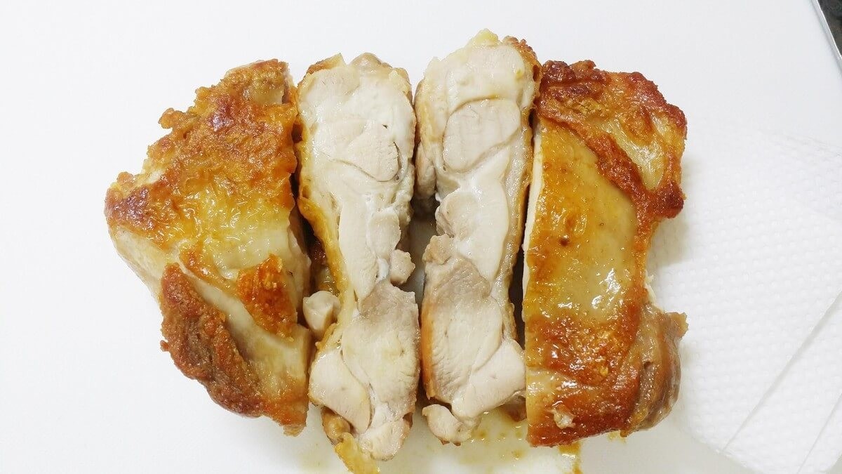 2晩冷やした鶏もも肉と見た目はあまり変わらず、おいしそうな焼き色です。でも皮のパリパリ感がちょっと少ないかも。