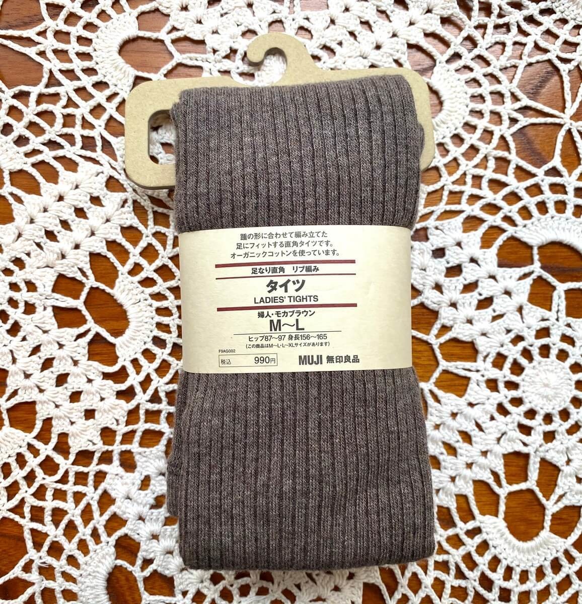 「足がスッキリと見えるタイツが欲しい」「歩きやすいタイツを探している」という方にぜひチェックして欲しいのが、無印良品の「足なり直角 リブ編み タイツ」。