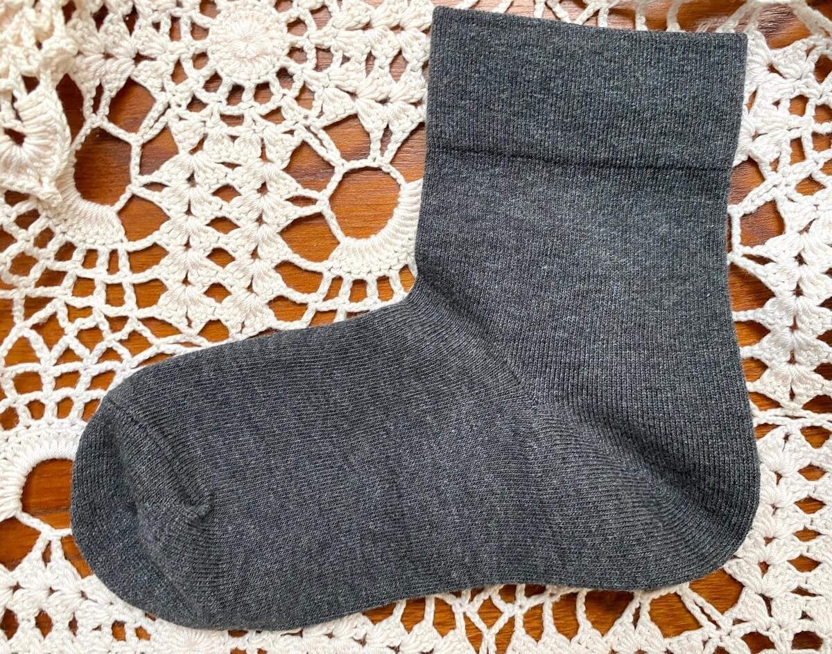 最初に紹介するのは、筆者が愛用している「足なり直角 口ゴムなし三層 リブなし ショート丈靴下」。