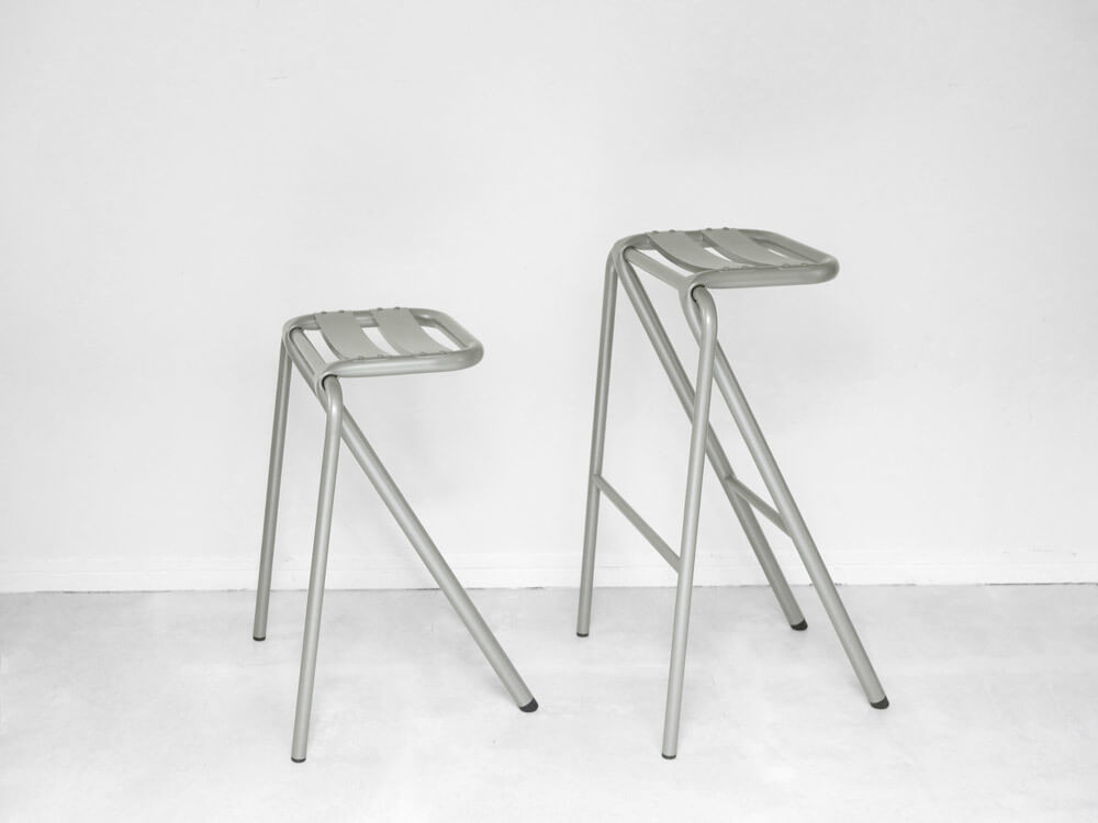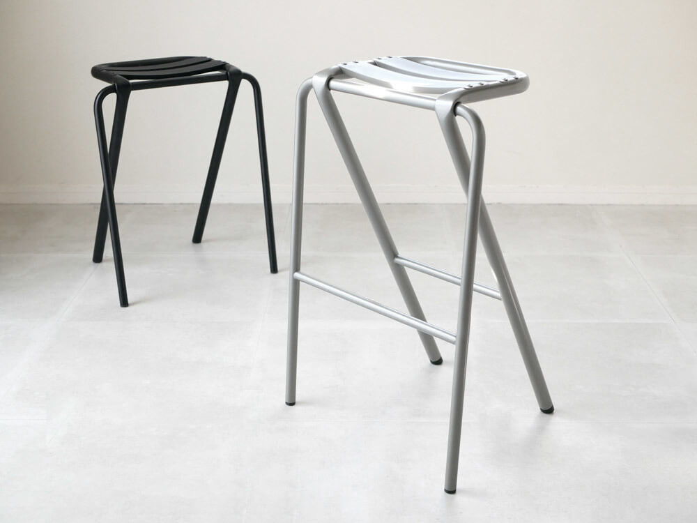 BENT STOOL(ベントスツール)は座面を保持する太いパイプが、前脚の細いパイプに巻きつくように後ろ脚を構成する独特なデザインのスツール。