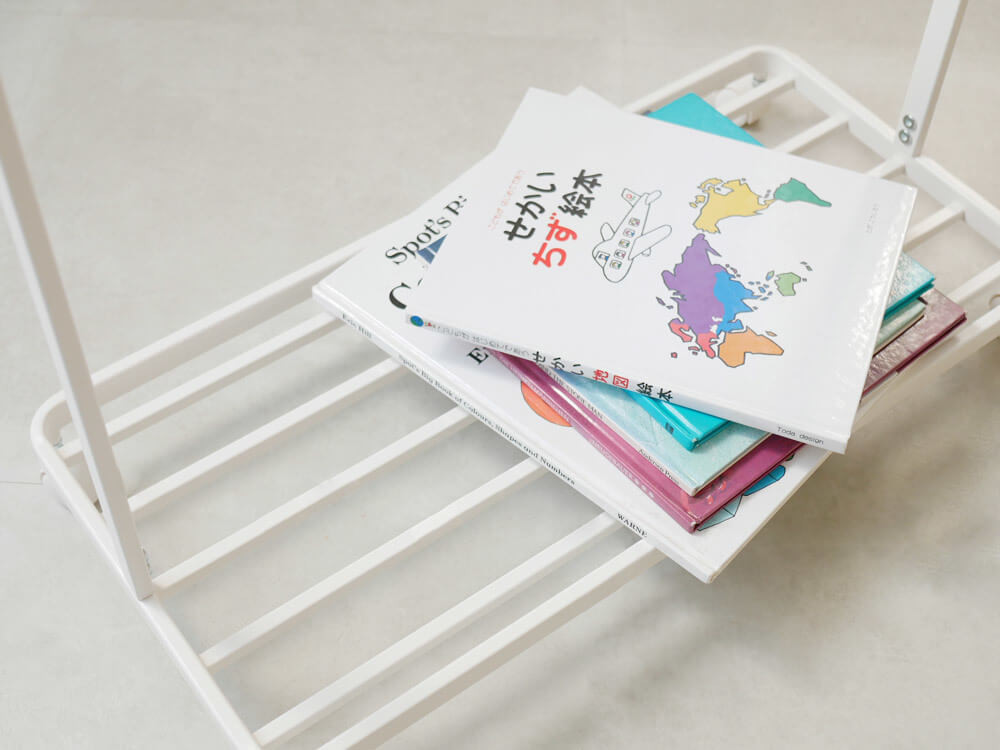 台座は大きめのラックになっているので掛けられない荷物を収納できます。耐荷重約10kgなので、教科書や図鑑、鍵盤ハーモニカなどもOK。