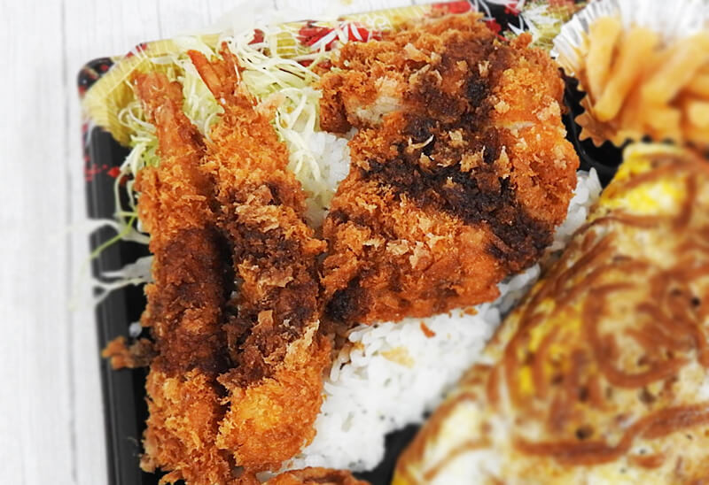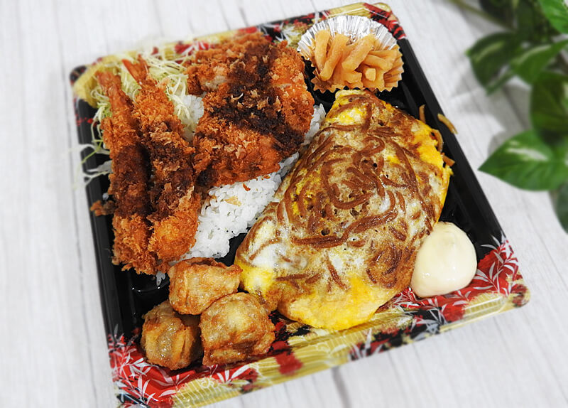 今回、私は「オム焼きそばと海老・チキンカツのソースカツ弁当」と「オム焼きそばとから揚げ・メンチカツのソースカツ弁当」をテイクアウトしてきました。