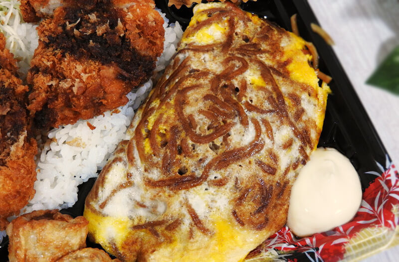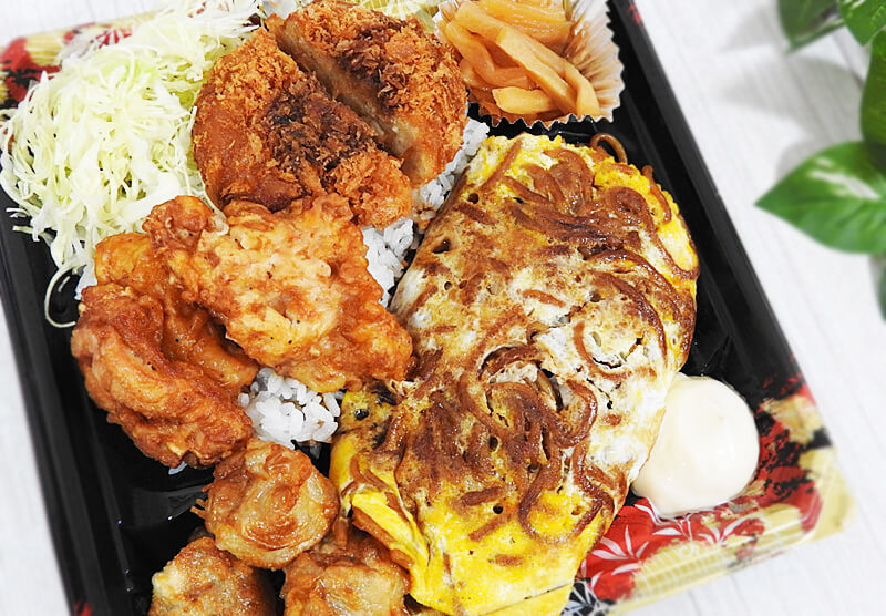 一面に広がる揚げ物とオム焼きそば。お弁当というよりは、ちょっとしたオードブルのようです。勢いで2種類テイクアウトしてしまいましたが、完食できるか不安になってきました……。