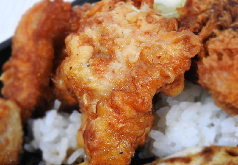 から揚げは2個入っていましたが、一般的なスーパーではなかなかお目にかからないような大きさにびっくりしました。お箸で掴んで写真を撮ろうとしましたが、重みがあって失敗……。