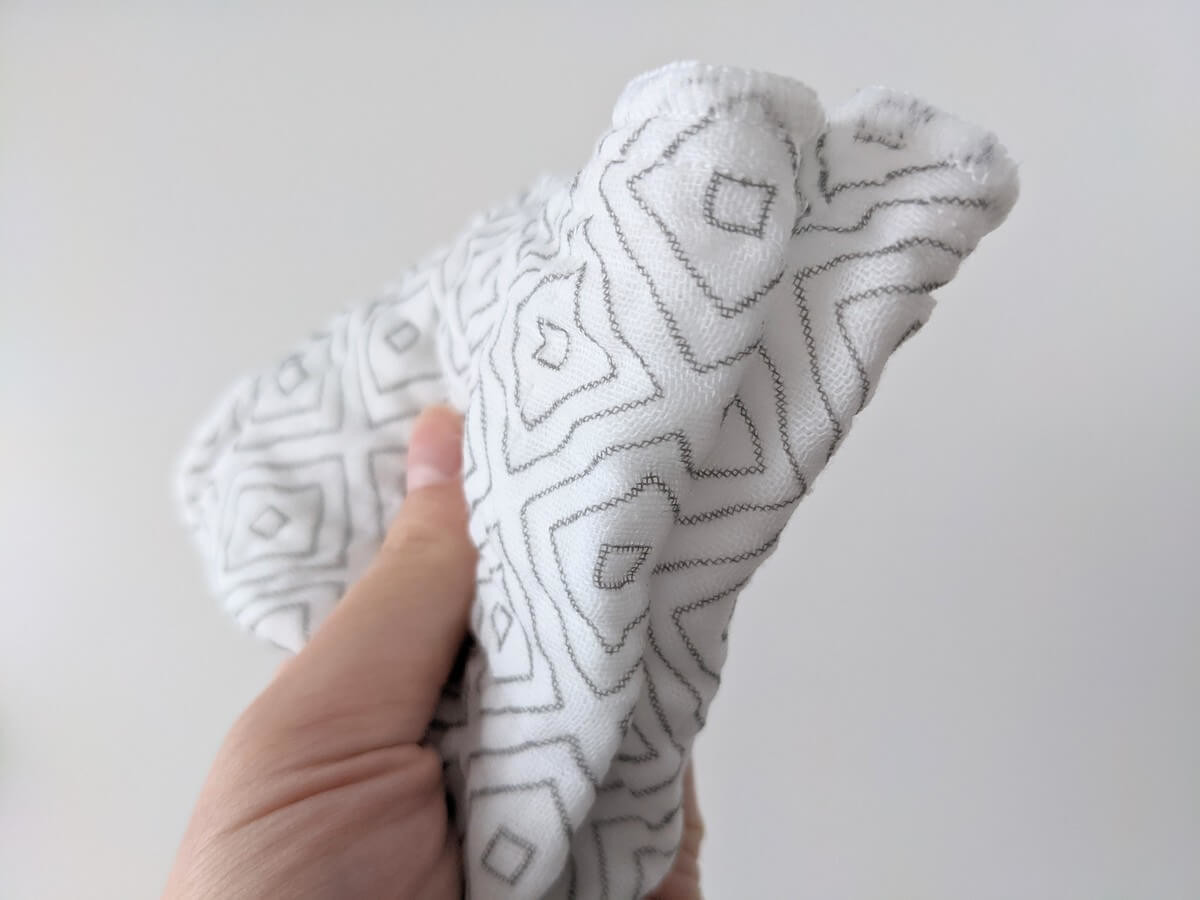 お得な5枚セットになっていて、1枚あたりのお値段は66円(税込)と安い♪ 以前はセリアのかや織ふきんを使っていましたが、コスパの良さに惹かれスリーコインズに乗り換えました♪