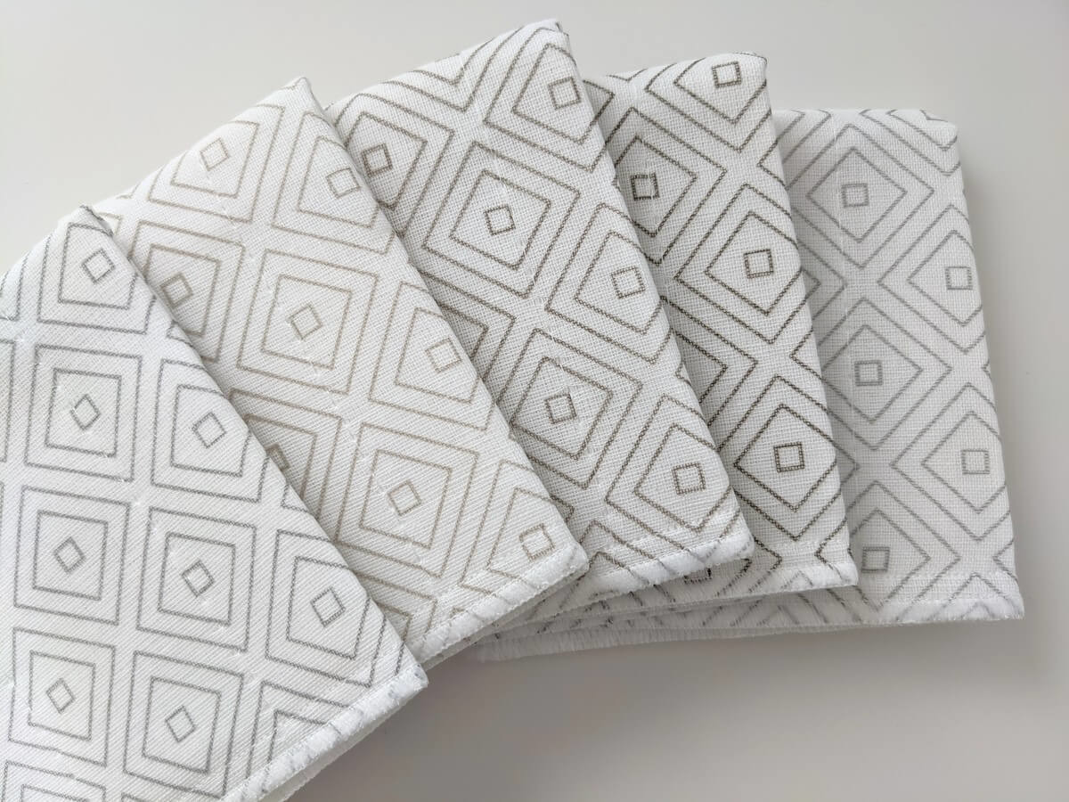 スリーコインズのかや織ふきんは、「グレー」と「ベージュ」の2種類あります。 色によってデザインが異なりますが、どちらも上品で素敵な和柄です。