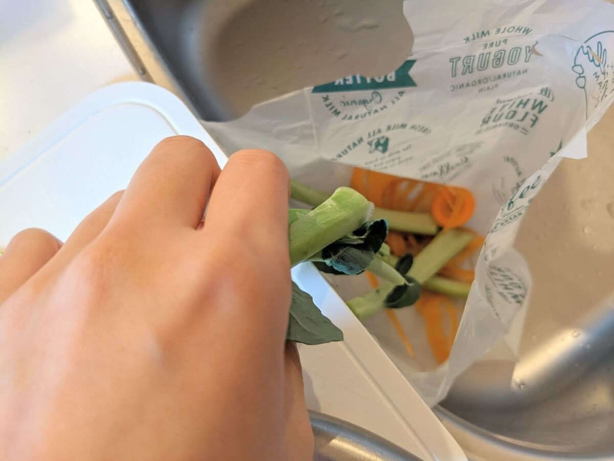さらにゴミ袋に水切り穴が開いていて、汁気のある食材も気にせず投入できます。