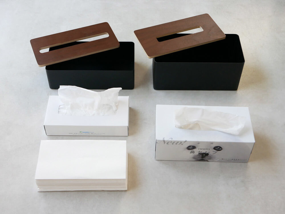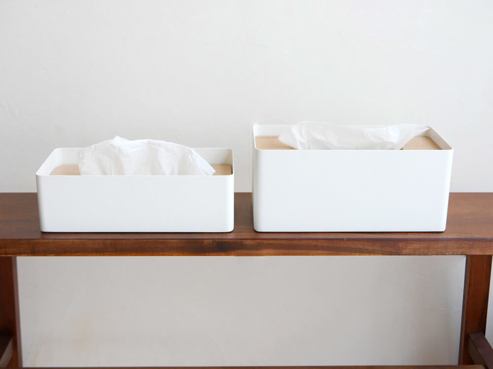 「蓋付きティッシュケース L (左)」と「厚型対応蓋付きティッシュケース(右)」の2サイズをご用意しました。