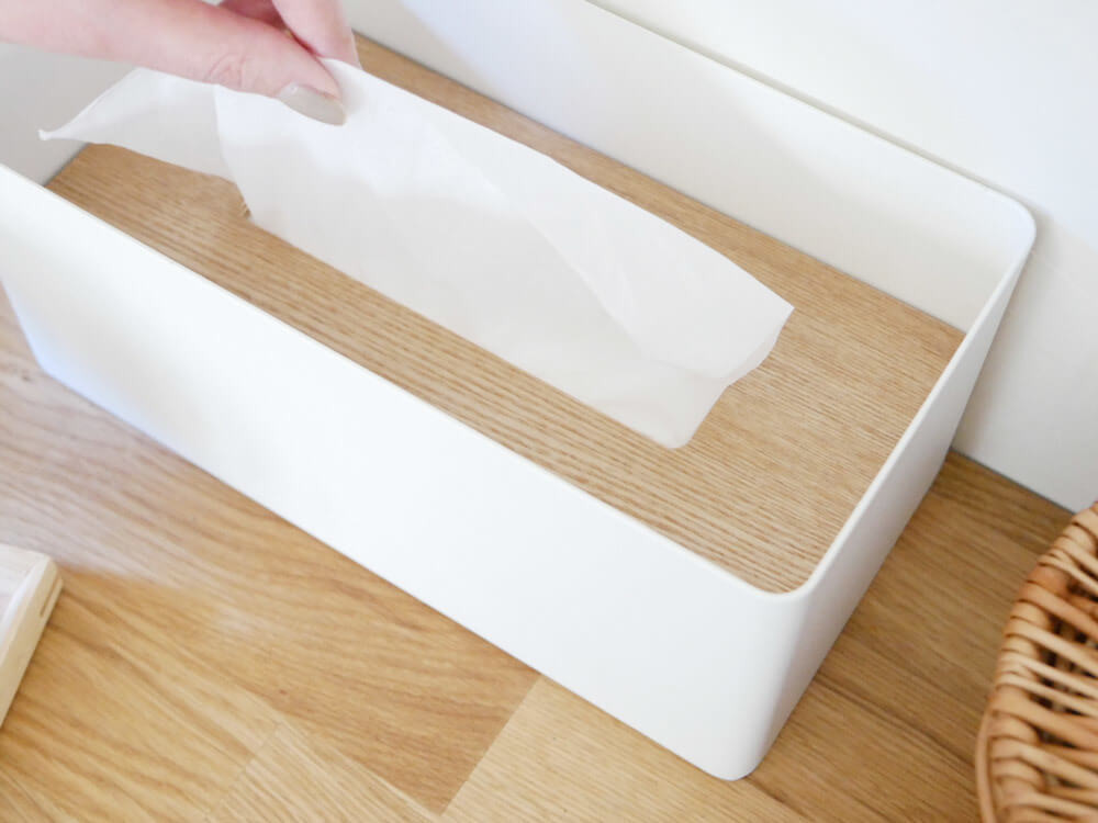 安定し大きな取り出し口のフタなのでティッシュを取り出す際にスムーズ。また、ボックスティッシュの中身だけを入れて使うと、使っていくたびにフタが沈むので残量や交換のタイミングが一目で分かるのも便利ですね。