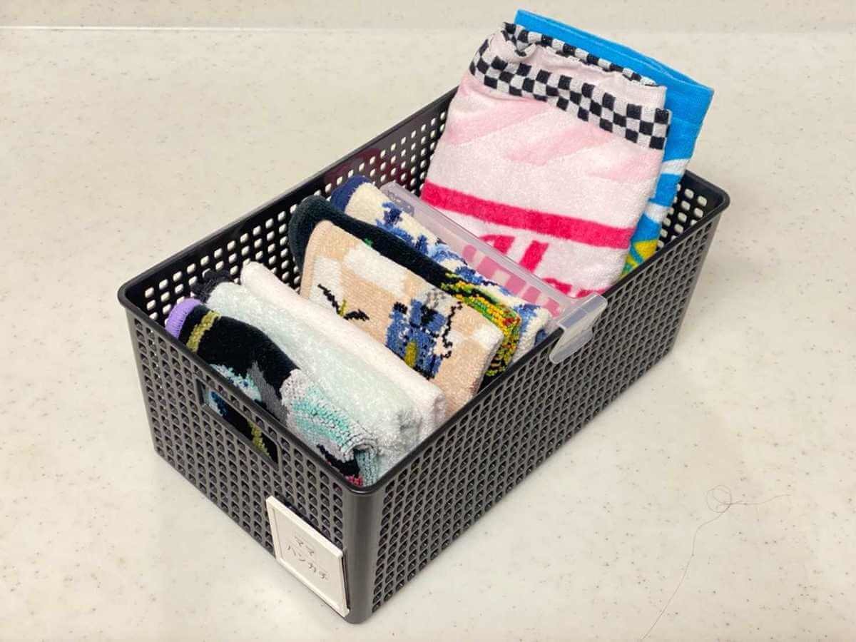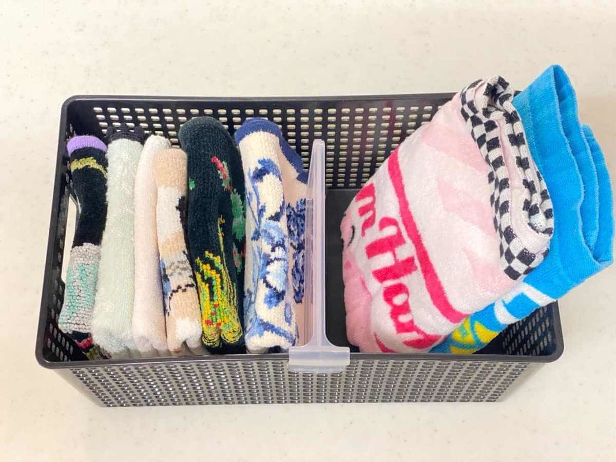 これは私のハンカチとタオルの収納カゴ。今までは境目がなかったのでゴチャゴチャしがちだったのですが、間に仕切りを挟むだけでそれぞれが自立し、種類分けができました!