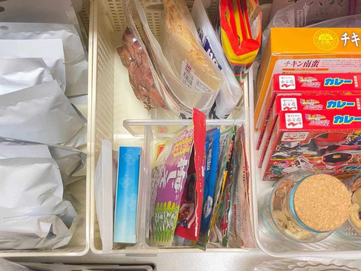 また、意外と幅をとるふりかけや調味料の収納にもぴったりでした!このようにふりかけコーナーを仕切りで囲えば、1つの収納カゴの中で複数のジャンルのものを収納できます。