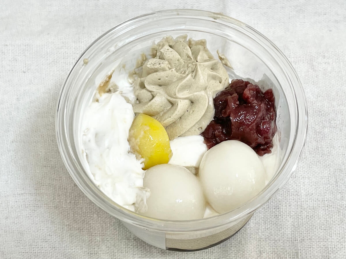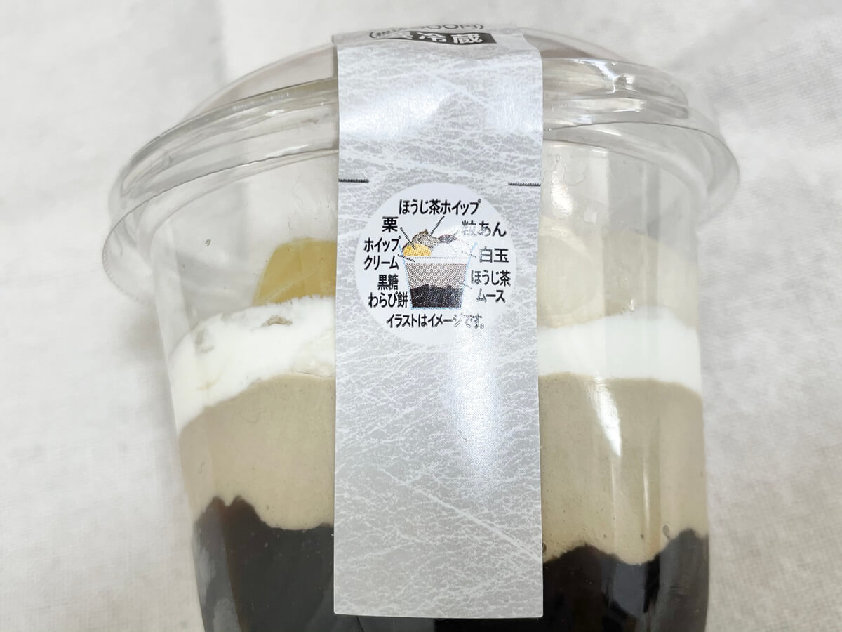 パッケージに中身が分かるイラストがありました。 黒糖わらび餅、ほうじ茶ムース、ホイップクリームと順に重なっていて、粒あん、白玉、栗、ほうじ茶ホイップがトッピングされています。