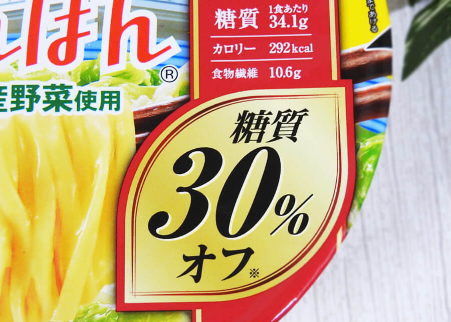 糖質30%カットしており、1食あたりの糖質量は34.1g。カップ麺としては糖質を押さえていると思います。