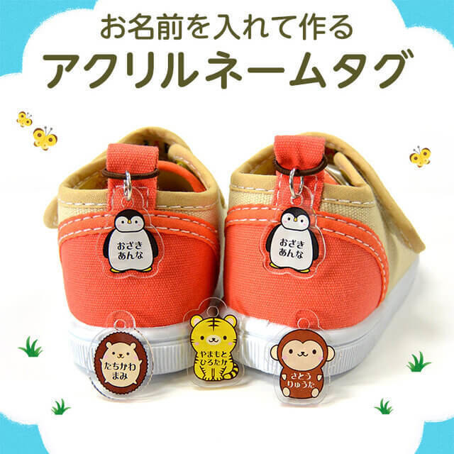 そんなときは、こちらのアクリルネームタグを付けてあげると自分の靴ということがひと目で分かります。かわいい動物のイラストが目印になるので、文字が読めない子どもでも大丈夫♪