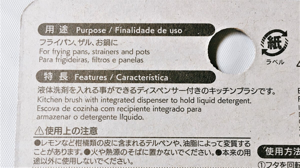 商品パッケージの裏を見てみると……『液体洗剤を入れることができるディスペンサー付きのキッチンブラシです。』と書いてありました。