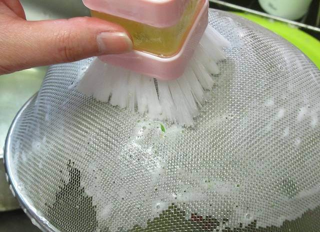 目が細かいザルを洗ってみました。とにかく洗剤がしっかり泡立ってくれるので、こちらはスッキリ洗いあがり完了!