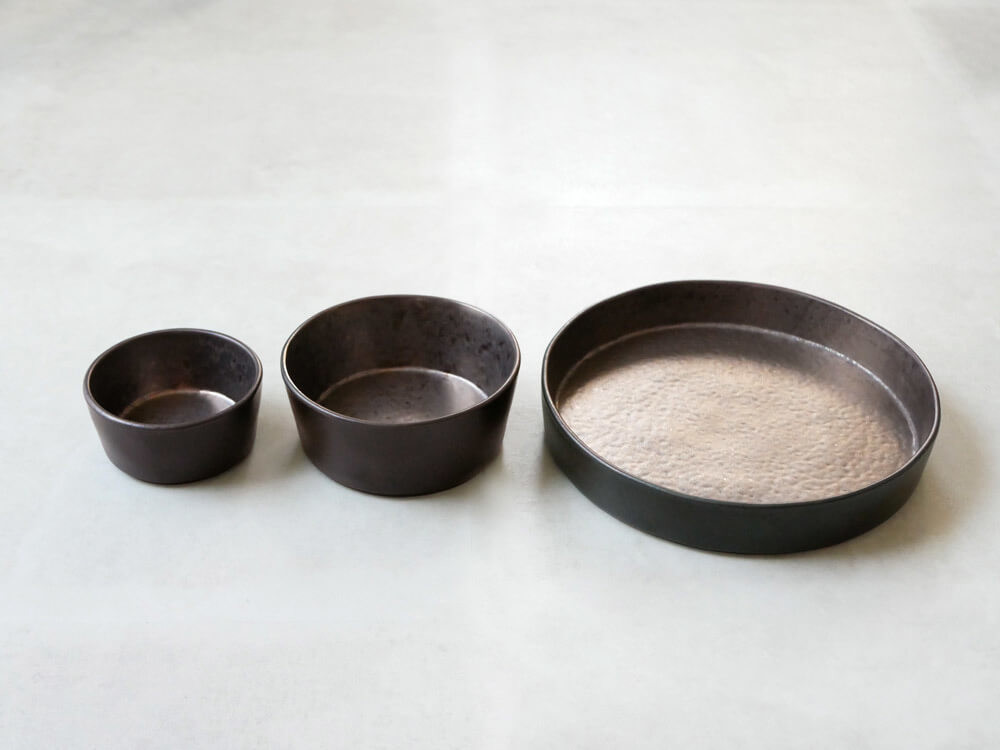 手でつくったような温かみのあるさりげない凹凸と金属の打ち出し加工。モダンで都会風のバランスが魅力の食器です。日常使いから特別な日まで、いつでもおしゃれに仕上げてくれます。